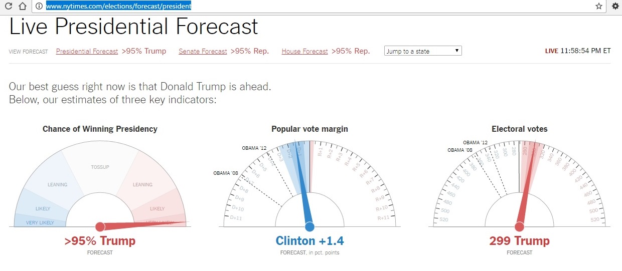 Шанси республіканця Дональда Трампа виграти вибори 45-го президента США наблизилися до 95% (за онлайн-прогнозом NY Times).