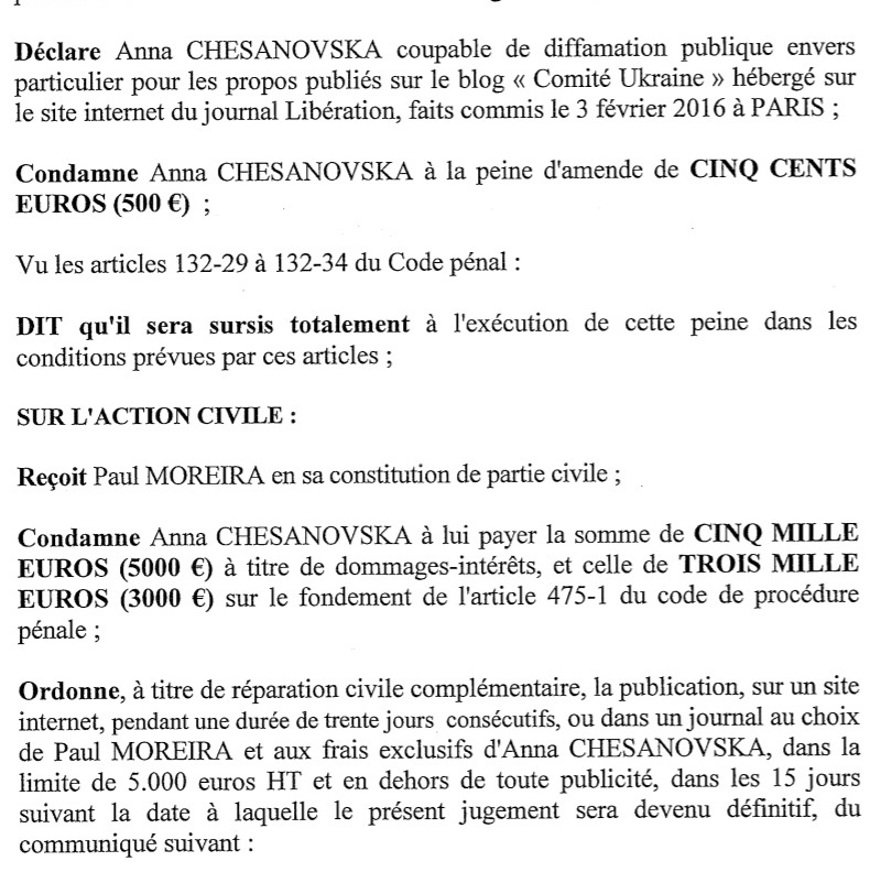 Суд у Парижі виніс ухвалу проти української перекладачки Анни Чесановської у справі за позовом скандального режисера Поля Морейри, автора фільму “Україна, маски революції”, зобов’язавши її сплатити штраф та компенсацію, які можуть перевищити 13 тисяч євро.
