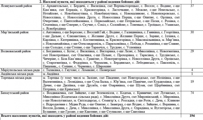 Близький до Генштабу волонтер Роман Донік опублікував визначений ГШ й ООШ перелік населених пунктів Донецької та Луганської областей, що входять до зони бойових дій відповідно до нових правил у зв’язку з початком проведення операції Об’єднаних сил.