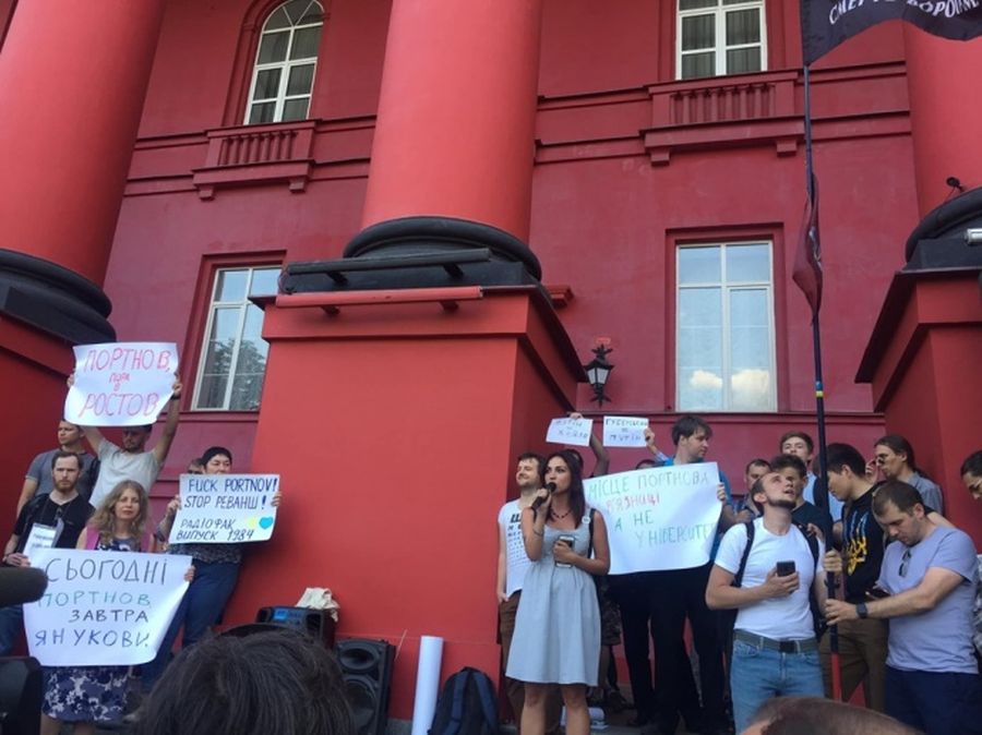 Під головним корпусом університету Шевченка в Києві триває протест проти поновлення колишнього заступника голови Адміністрації президента при Вікторі Януковичу Андрія Портнова на кафедрі конституційного права юридичного факультету.