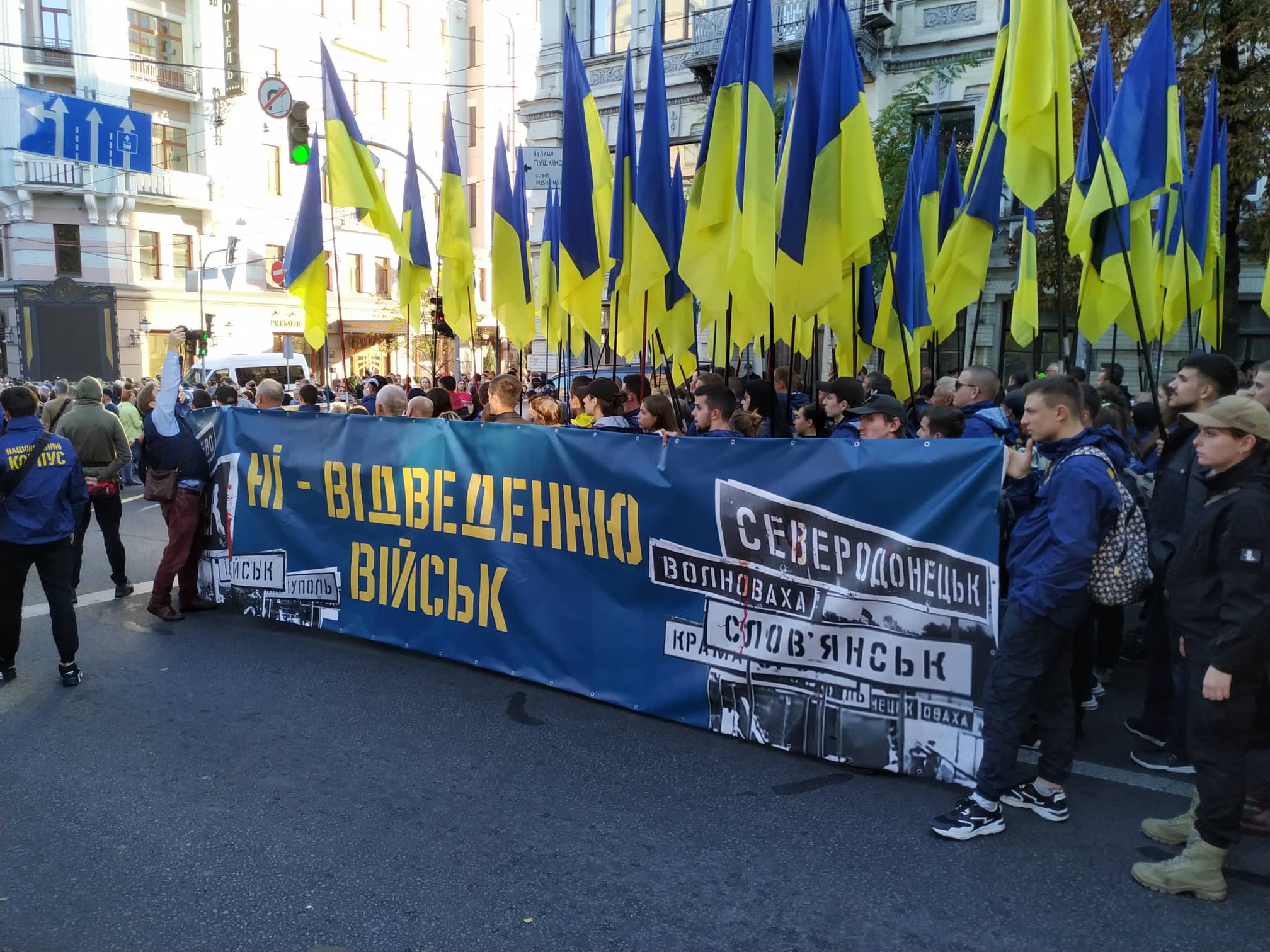 “Коробки” маніфестантів несли транспаранти із написами “Ні капітуляції!”, “Мінськ — зрада України”, “Лише перемога увінчує війну”, “Ні капітуляції”, “На коліна тільки перед Богом”, “Шлях до незалежності — від Московії до ЄС та НАТО”, “Війна до перемоги” тощо.