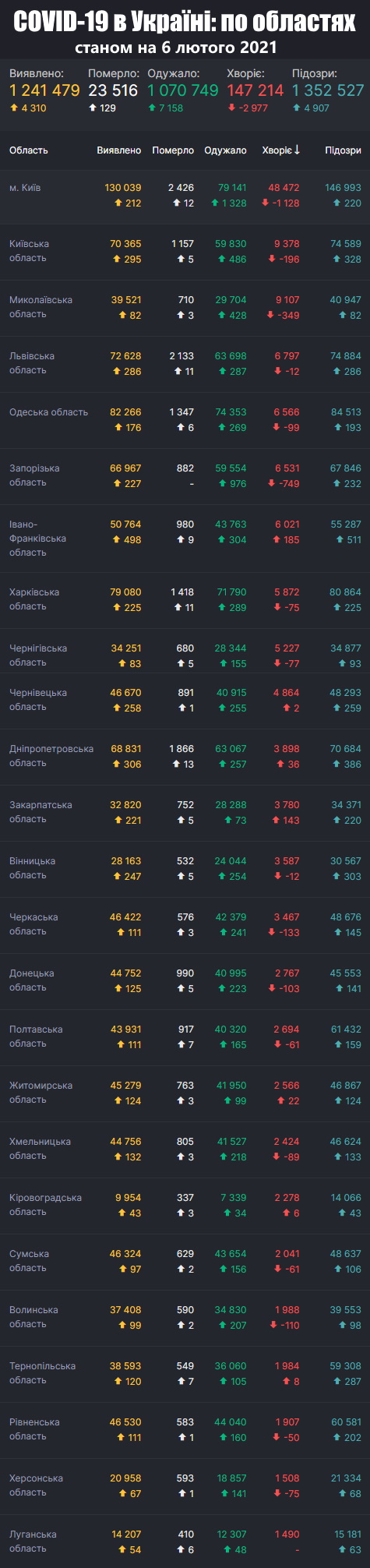 Протягом минулої доби, 5 лютого, в Україні виявили 4 310 нових випадків коронавірусної хвороби.