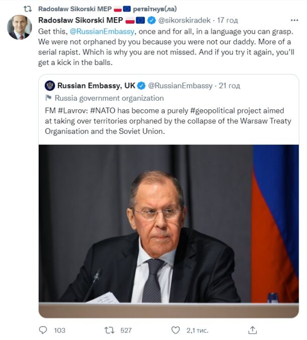 “Усвідом, російське посольство, раз і назавжди, зрозумілою тобі мовою. Ми не осиротіли, тому що ви не були нашим татком. Радше серійним ґвалтівником. Ось чому ви не досягнете мети. А якщо спробуєте ще раз, то отримаєте по яйцях” , – відповів Сікорський.
