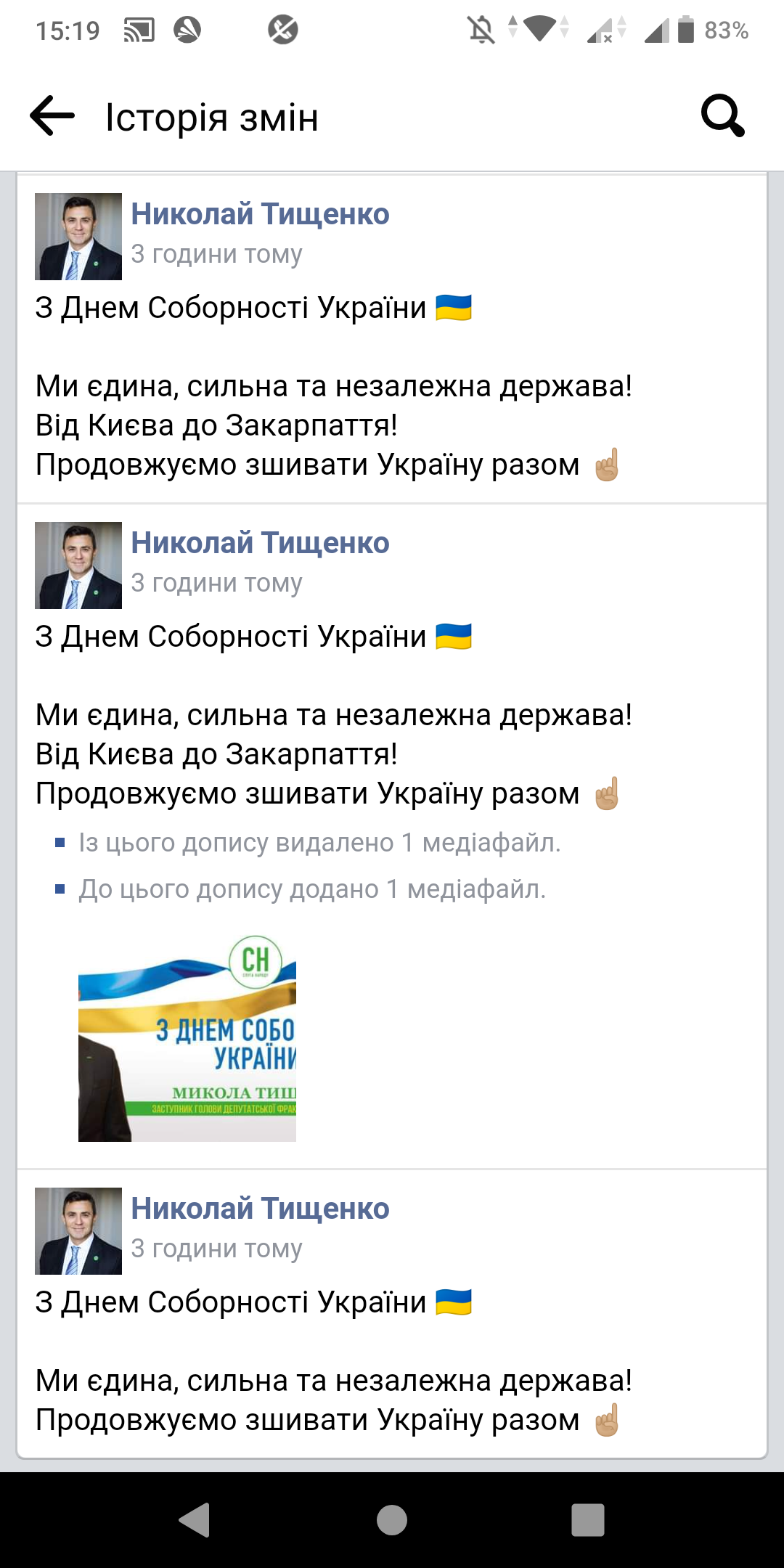 Тепер текст на сторінці Тищенка має такий вигляд: “З Днем Соборності України. Ми єдина, сильна та незалежна держава! Продовжуємо зшивати Україну разом”.