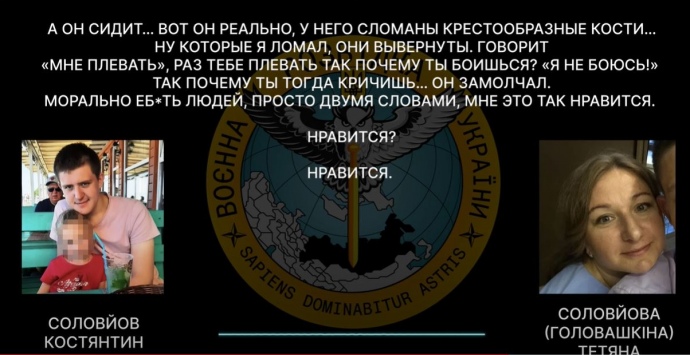 Також Соловйов розповідає, як ламав полоненим кістки, як українців забивають гумовими кийками до смерті, зрізають живцем шкіру з м’ясом, засувають у задній прохід колючий дріт і потім висмикують.