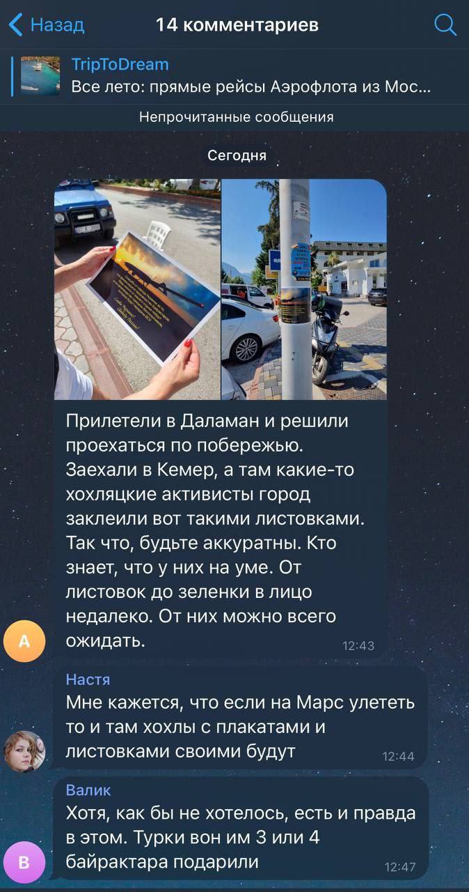 На курортах Туреччини, де відпочиває чимало росіян, з’явилися листівки із вдячністю російським туристам за “Байрактари” для України.