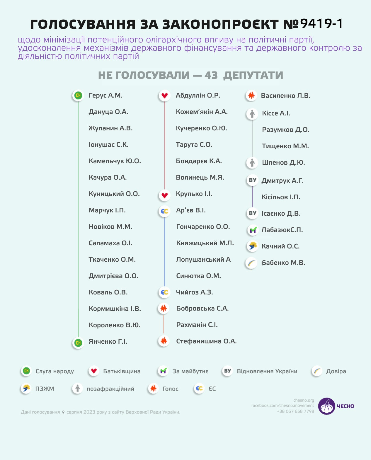 “Чесно” перерахував прізвища 43 депутатів, які не брали участь у голосуванні.