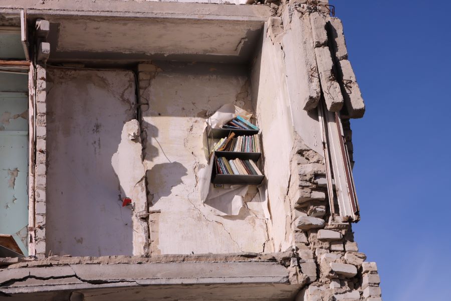 Книжкова поличка у зруйнованому будинку в Ізюмі. Фото: Ольга Герман / Новинарня