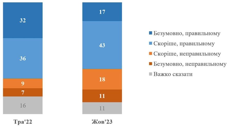 За півтора року від травня 2022-го до жовтня 2023-го кількість українців, які вважають, що справи в Україні розвиваються у правильному напрямку, зменшилася на 8%, а кількість тих, хто вважає протилежне – збільшилася на 13%.
