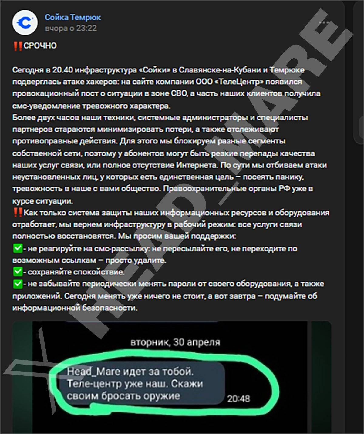 У ніч проти 1 травня учасники міжнародної хакерської групи Head Mare знищили інфраструктуру провайдера “Теле-Центр”, який надає послуги в містах Темрюк і Слов’янськ-на-Кубані Краснодарського краю РФ.