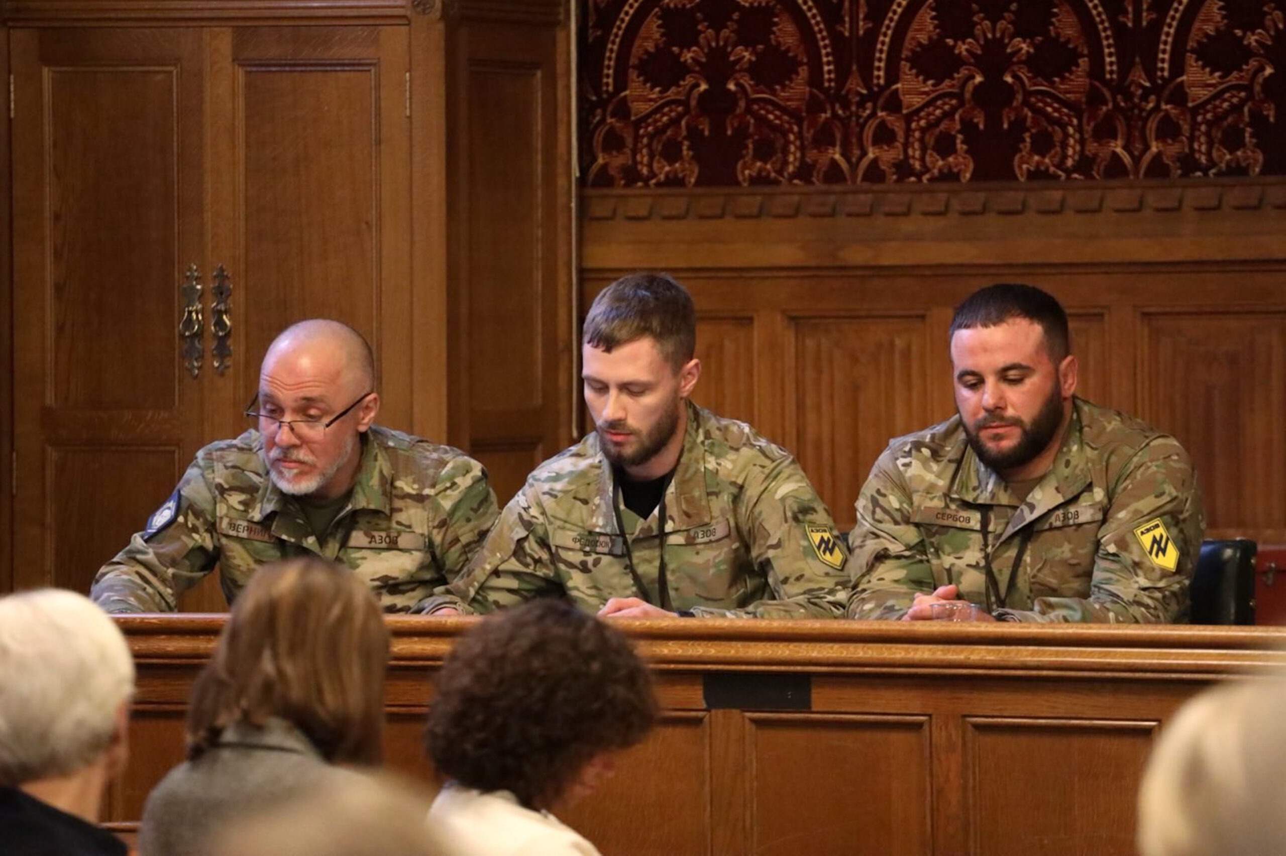 12-ту бригаду «Азов» під час круглого столу представляли двоє оборонців Маріуполя та колишніх військовополонених: лейтенант Арсеній «Процес» Федосюк та ветеран «Азову» Руслан «Давид» Сербов, а також молодший сержант Володимир «Зеландія» Вернигора, який став до лав бригади у 2023 році.