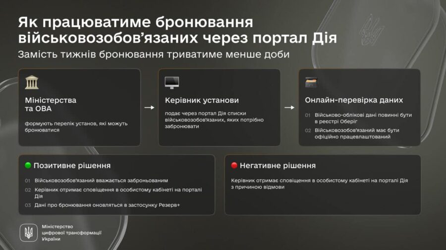 “Зараз, щоб забронювати співробітника, потрібно подавати заяви в паперовому вигляді, збирати підписи та тижнями чекати на результат. Дія це змінить. Процес буде швидким, прозорим і без людського фактору, а результат — за годину”, – каже Федоров.