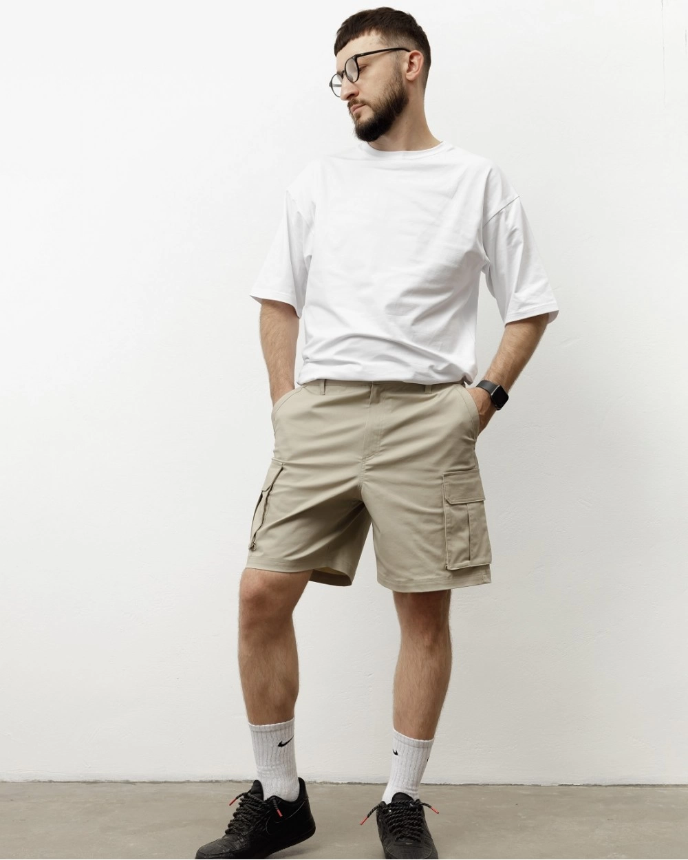 Трендові шорти карго із бічними кишенями у чорному і бежевому кольорах. Шорти вільного крою, застібаються на блискавку. Виготовлені із 95% бавовни і 5% еластану.