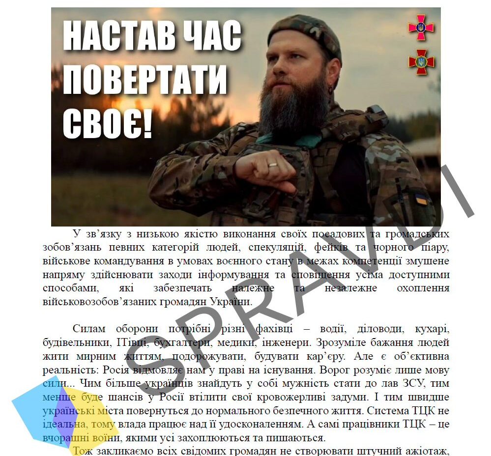 “Таким чином пропагандисти хочуть викликати супротив серед громадян щодо вступу до лав ЗСУ. Та створити панічні настрої та бажання покинути Україну. Розповсюдження псевдостатті від ГУР не допущено”, — заявили у Центрі.
