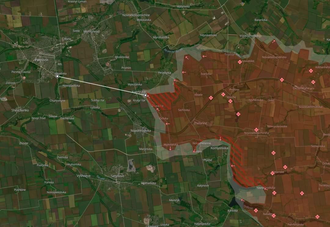 Згідно з мапою проєкту, від нових позицій ворога до міста Покровськ лишається 10 кілометрів.