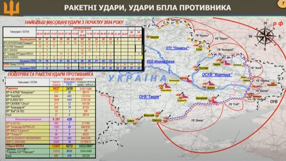 Відповідно до оприлюдненої ним статистики, від 24 лютого 2022 року ворог використав для ударів по Україні загалом 9590 ракет та 13997 дронів.