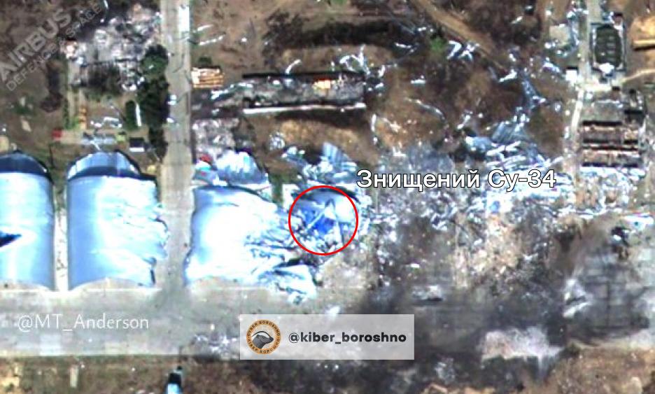 Крім того, у мережі оприлюднено знімки з аеродрому “Маринівка”, на яких видно, що в ангарах були літаки і вони зазнали пошкоджень. Як зазначається, в ангарах щонайменше 1 Су-34 знищено та один пошкоджено. Також пошкоджені інші ангари, де могли стояти борти.