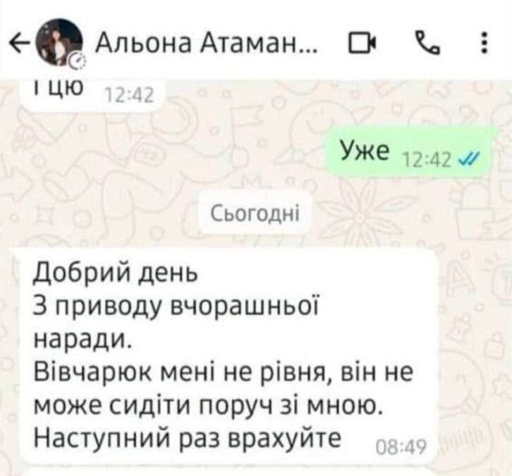 Скріншот оприлюднив на сторінці у Facebook користувач Саня Соколовський. У дописі йдеться, що Атаманюк “написала одному з працівників управління з питань ветеранської політики ОВА, що керівник управління Валерій Вівчарюк не може сидіти поруч з нею, бо він не її рівня”.