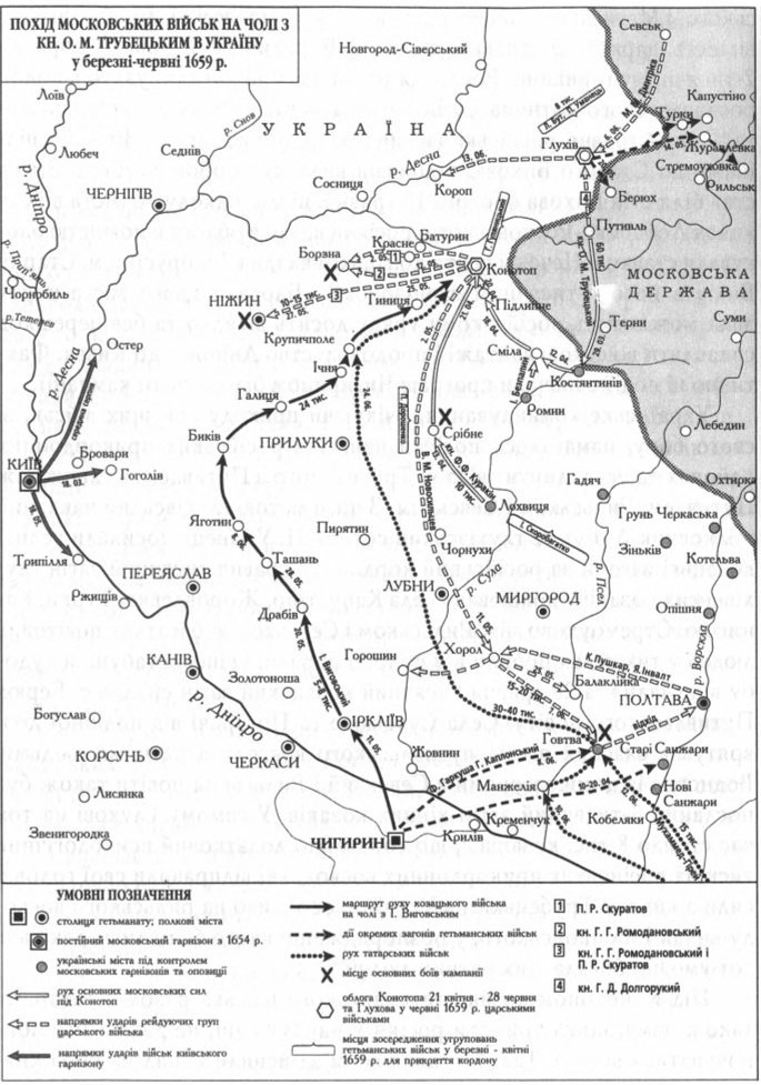 Карта весняно-літньої кампанії 1659 року на Лівобережжі під час московсько-української війни 1658-1659 років. З книги Андрія Бульвінського “Українсько-російські взаємини 1657-1659 рр. в умовах цивілізаційного розмежування на сході Європи”, Київ, 2008 рік