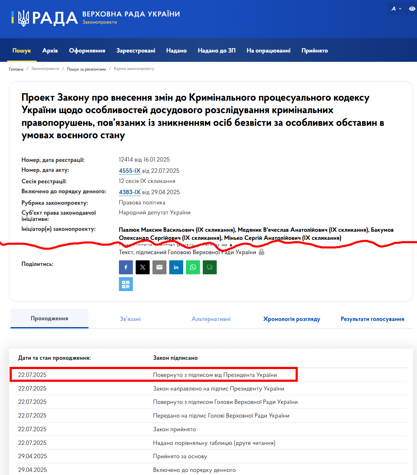 Підпис глави держави ввечері 22 липня відображений у картці проєкту закону “Про внесення змін до Кримінального процесуального кодексу України щодо особливостей досудового розслідування кримінальних правопорушень, пов’язаних із зникненням осіб безвісти за особливих обставин в умовах воєнного стану” на сайті Верховної Ради.