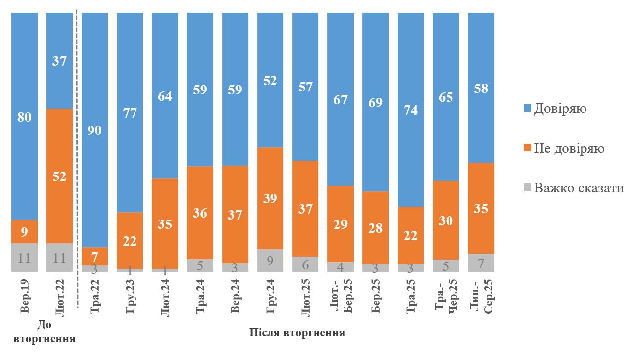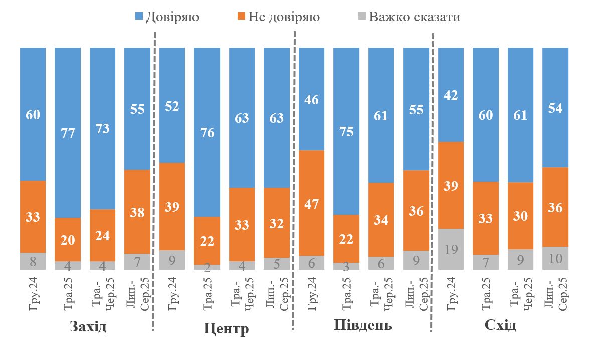 У Центрі рівень довіри не змінився (63% на початку літа і стільки ж зараз). На Півдні і Сході також є зниження, але в меншій мірі, ніж на Заході. Так, на Півдні рівень довіри знизився з 61% до 55%, на Сході – з 61% до 54%.
