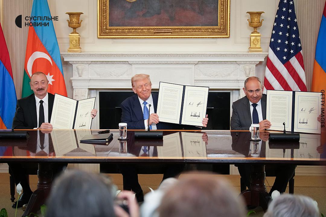 Президент Азербайджану Ільхам Алієв і прем’єр-міністр Вірменії Нікол Пашинян у Білому домі в Вашингтоні за посередництва президента США Дональда Трампа підписали рамкову мирну угоду.
