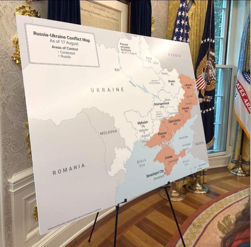 На тлі візиту президента України до Вашингтона Білий дім опублікував фотографію із президентом Дональдом Трампом, який щось пояснює Володимиру Зеленському в Овальному кабінеті біля великої мапи з територією України. На карті східна частина країни зафарбована рожевим кольором та ілюструє територію, яку наразі контролюють російські окупаційні сили.