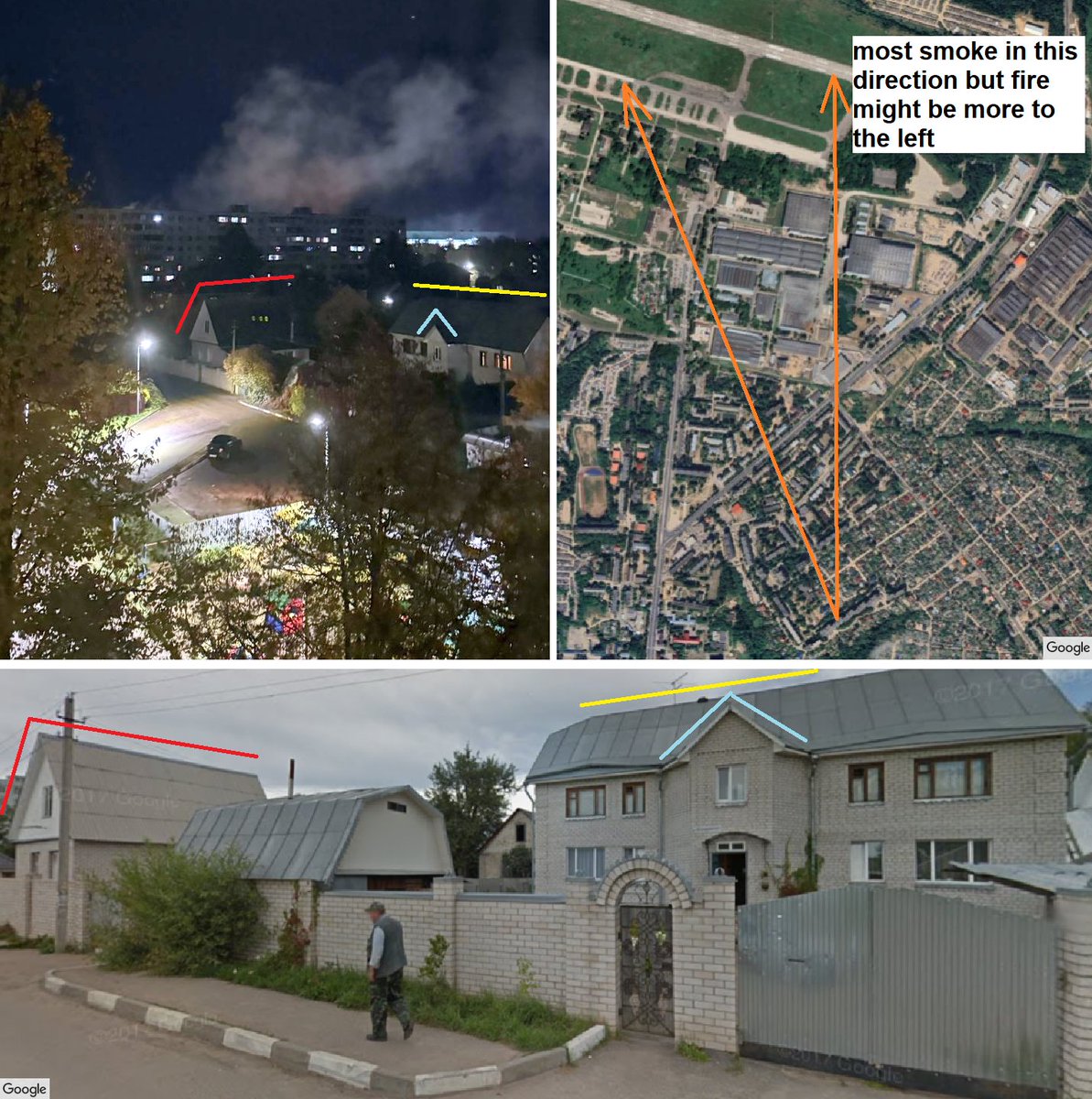 OSINT-фахівець Blinzka на своїй сторінці у Х провів геолокаційний аналіз відео, в результаті якого вдалося визначити точне місце розташування оператора 54.81031, 32.05208 та напрям знімання. Аналіз показав, що підняття диму відбувалося зі сторони авіаційного заводу.