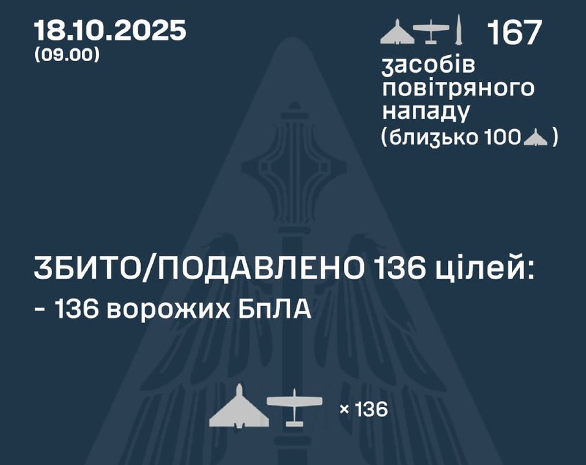 За попередніми даними, станом на 09:00, протиповітряною обороною збито/подавлено 136 ворожих БпЛА типу Shahed, “Гербера” і дронів інших типів на півночі, півдні, сході та в центрі країни.