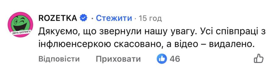 Бренд співпрацював з Ангеліною Пичик у разовій інтеграції, кажуть в пресслужбі Rozetka. Відзнятий контент видалять, а всі подальші прояви скасують, пише видання Forbes.