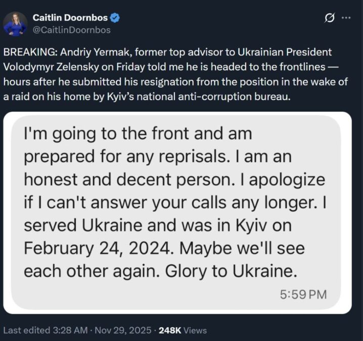 Колишній керівник Офісу президента України Володимира Зеленського Андрій Єрмак повідомив, що йде на фронт після того, як подав у відставку на тлі корупційного скандалу та слідчих дій НАБУ у його помешканні.