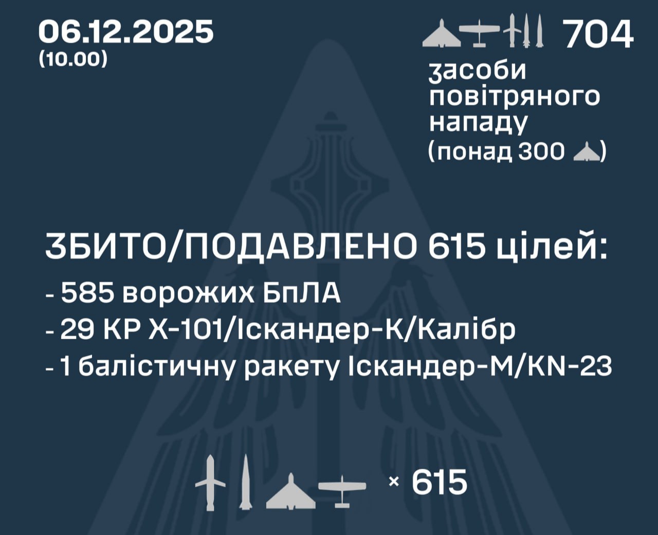 У ніч на 6 грудня (з 18:00 5 грудня) російські війська завдали комбінованого удару по об’єктах критичної інфраструктури України із застосуванням ударних БпЛА, ракет повітряного, морського та наземного базування.
