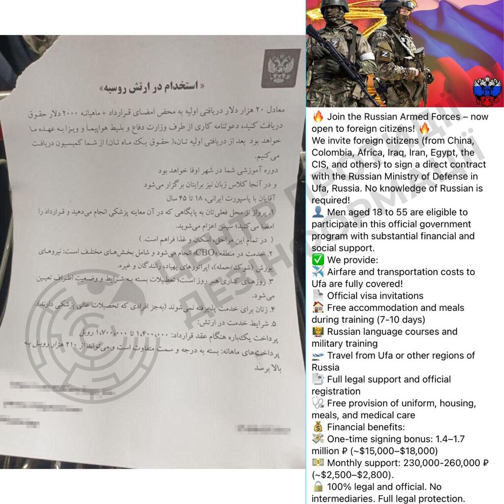 Оголошення ведуть до Telegram-каналу, створеного в листопаді 2025 року, де вербування здійснюється кількома мовами. Рекрутер, з яким поспілкувалися журналісти, прямо заявив, що кампанія координується російською стороною на території Ірану.