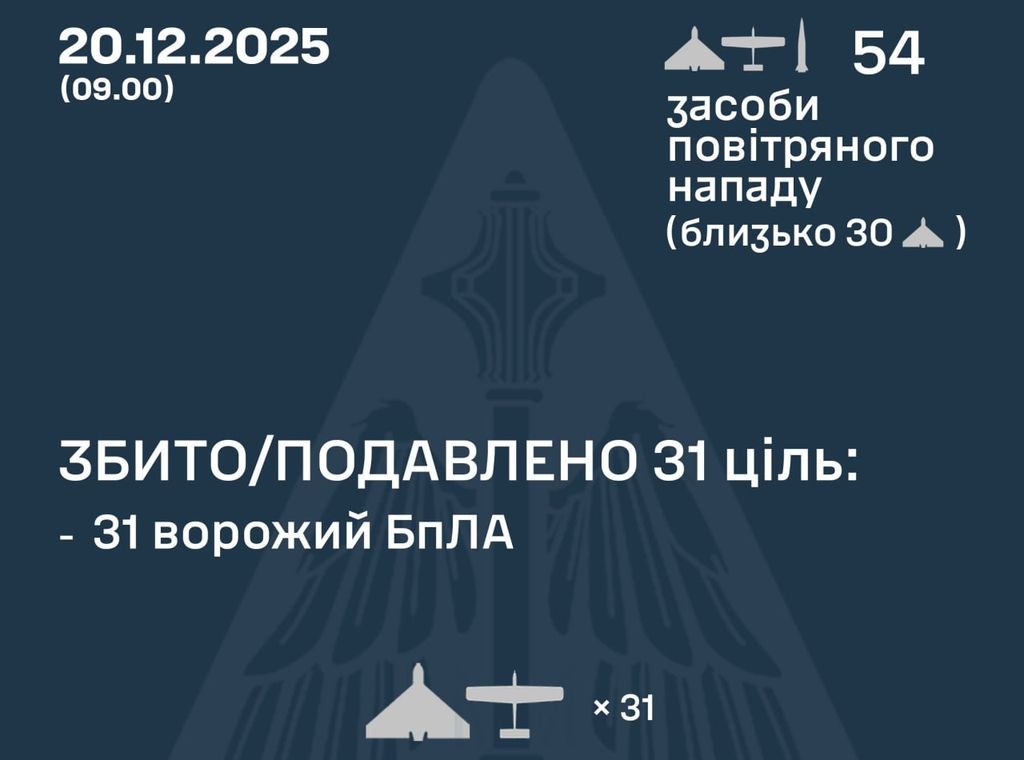 За попередніми даними, станом на 09:00, протиповітряною обороною збито/подавлено 31 ворожий БпЛА типу Shahed, “Гербера” і дрони інших типів на півночі, півдні та сході країни.