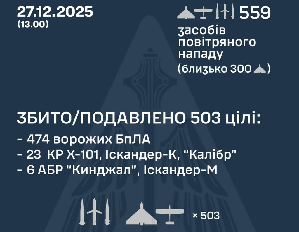 У ніч на 27 грудня (з 18:00 26 грудня) російські війська завдали комбінованого удару по об’єктах критичної інфраструктури України із застосуванням ударних БпЛА, ракет повітряного, морського та наземного базування. Основний напрямок удару – Київщина.