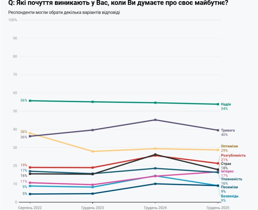 Надія стабільно залишається домінуючим почуттям серед українців щодо власного майбутнього упродовж усіх років повномасштабного вторгнення. У грудні 2025 року її згадали понад половина опитаних (54%). Цей показник майже не змінювався з 2022 року, попри затяжну війну та складну безпекову ситуацію.