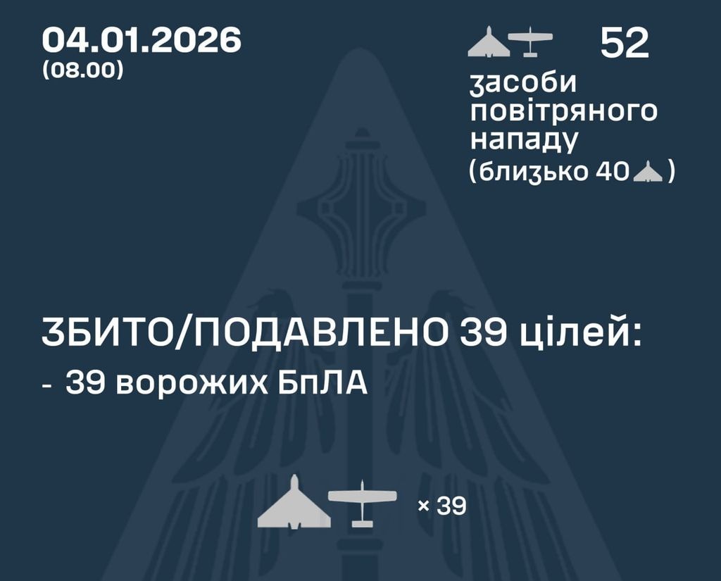 У ніч на 4 січня (з 19:00 3 січня) російські війська атакували Україну 52 ударними БпЛА типу Shahed, “Гербера” і безпілотниками інших типів із напрямків: Орел, Брянськ, Курськ – РФ, Донецьк – ТОТ, близько 40 із них – “шахеди”.