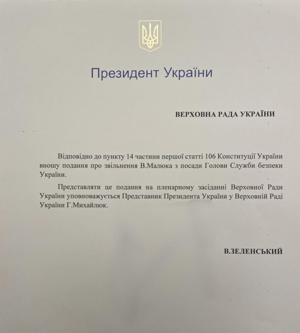 До Верховної Ради України надійшло подання президента Володимира Зеленського про звільнення Василя Малюка з посади голови Служби безпеки України.