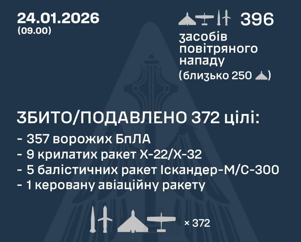 У ніч на 24 січня (з 18:00 23 січня) російські війська здійснили комбінований удар по Україні із застосуванням ракет різних типів повітряного, наземного базування та ударних БпЛА.