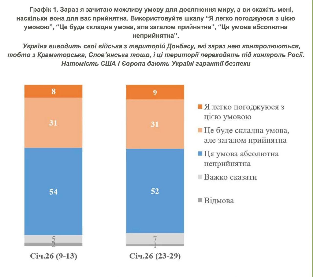 “З кінця 2025 року значна частина дискусій навколо потенційних мирних домовленостей стосується територій, які Україна контролює в Донецькій області. Зокрема, обговорюється пропозиція передати під контроль Росії весь Донбас в обмін на гарантії безпеки від Європи і США. Тому у середині січня 2026 року ми вперше поставили запитання про конкретно таку пропозицію (Росія – отримує контроль над усім Донбасом, Україна – отримує гарантії безпеки від Європи і США). Зараз, у кінці січня 2026 року, ми повторно поставили це запитання для розуміння, як важка ситуація в країні через наслідки російських ударів по енергетиці могла позначитися на ставлення до такої пропозиції.