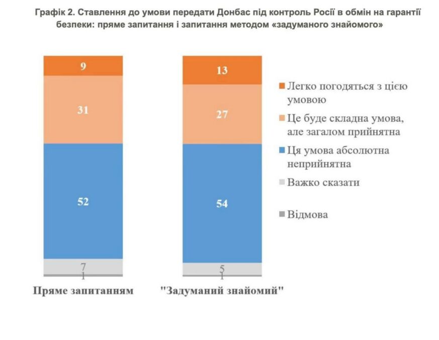 Половині респондентів ми ставили пряме запитання, як вони ставляться до пропозиції передати контроль над Донбасом Росії в обмін на гарантії безпеки. Водночас ми також провели експеримент і другій половині респондентів ставили запитання методом «задуманого знайомого». Ми хотіли оцінити щирість відповідей респондентів, враховуючи чутливість питання. Далі наводяться результати для прямого запитання (графік 1), а потім (графік 2) – результати експерименту.