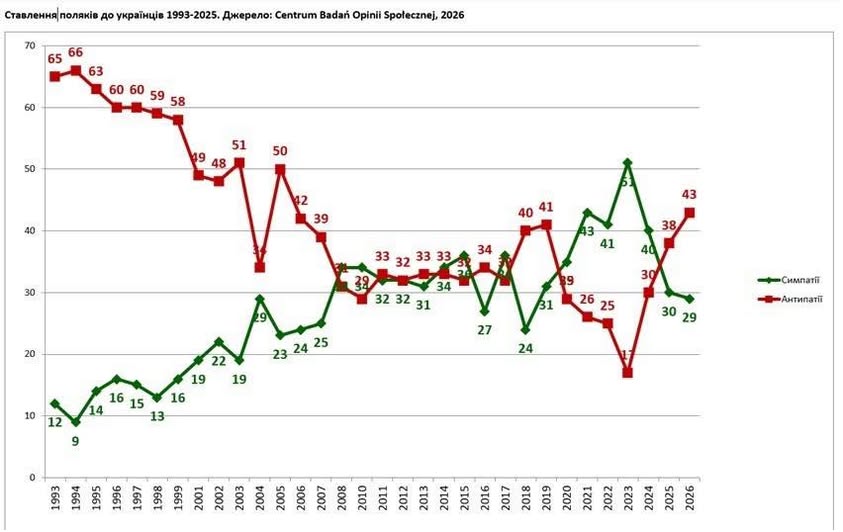 Однак соціологія дає іншу картину. Дані Центру дослідження громадської думки (CBOS), які відстежують ставлення поляків до українців упродовж тривалого часу — з 1993 до 2025 року, — показують чітку динаміку змін. Рівень симпатій і антипатій не був сталим: він зростав і падав у різні періоди, попри те, що історичне минуле залишалося незмінним. Той самий історичний «багаж» у різні роки супроводжувався принципово різним суспільним настроєм.