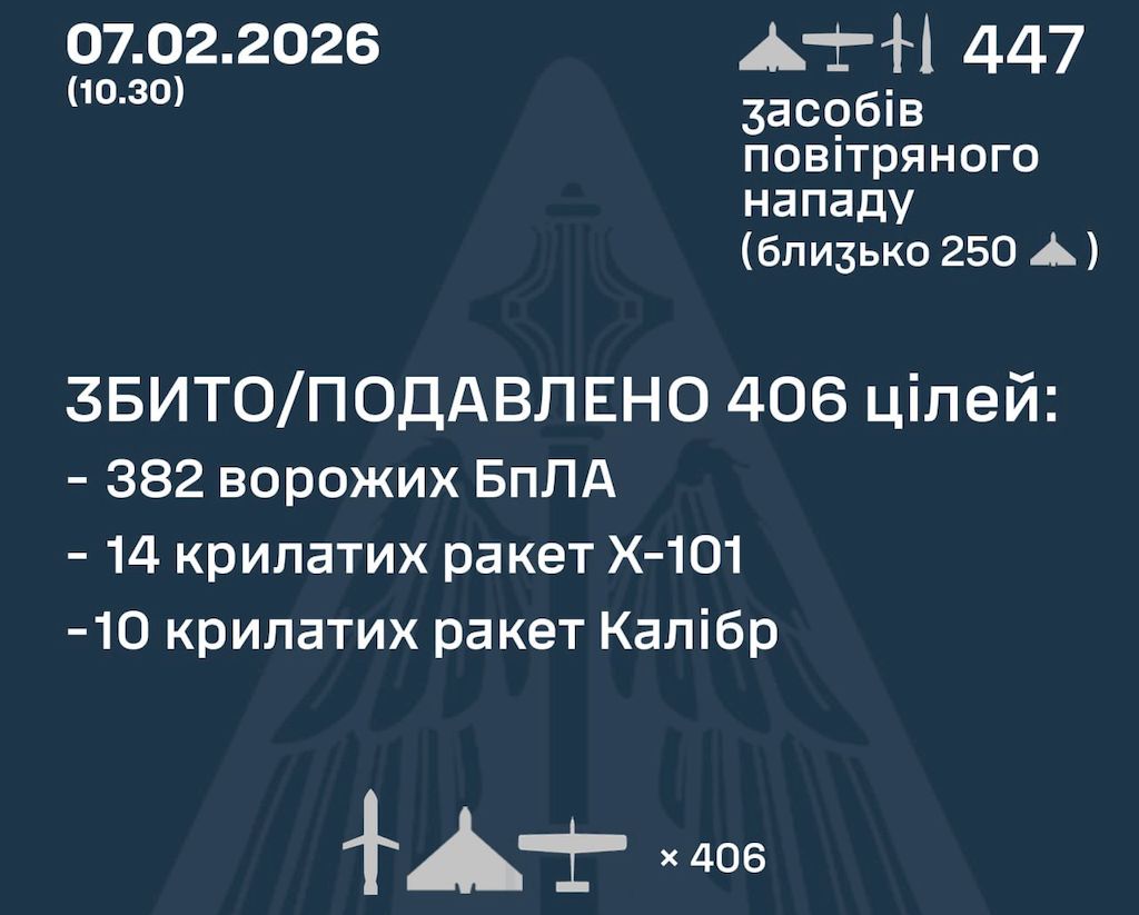 У ніч на 07 лютого (з 19:00 06 лютого) російські війська завдали комбінованого удару по об’єктах критичної інфраструктури України із застосуванням ударних БпЛА, ракет повітряного, наземного та морського базування.
