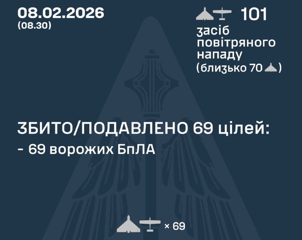 За попередніми даними, станом на 08:30, протиповітряною обороною збито/подавлено 69 ворожих БпЛА типу Shahed, “Гербера”, “Італмас” та дронів інших типів на півночі, півдні та сході країни.