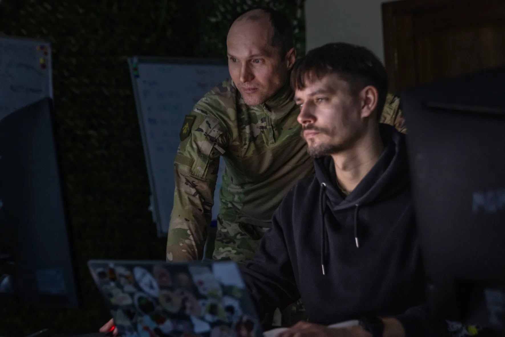 Позаду нього в підземному оперативному пункті мерехтять понад 20 екранів. Кожен транслює аналогове відео з дронів із різних ділянок фронту й у режимі реального часу наповнює кімнату сценами життя та смерті солдатів.