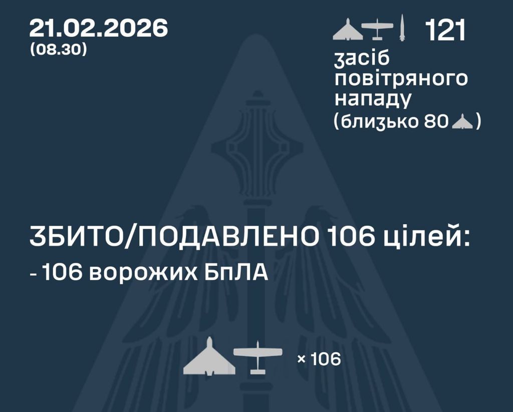 У ніч на 21 лютого (з 18:00 20 лютого) російські війська атакували Україну однією балістичною ракетою “Іскандер-М” із Воронезької обл. – РФ, а також 120 ударними БпЛА типу Shahed, “Гербера”, “Італмас” та безпілотниками інших типів із напрямків: Брянськ, Курськ, Орел, Шаталово, Приморсько-Ахтарськ – РФ, Гвардійське – ТОТ АР Крим, близько 80 із них – “шахеди”.