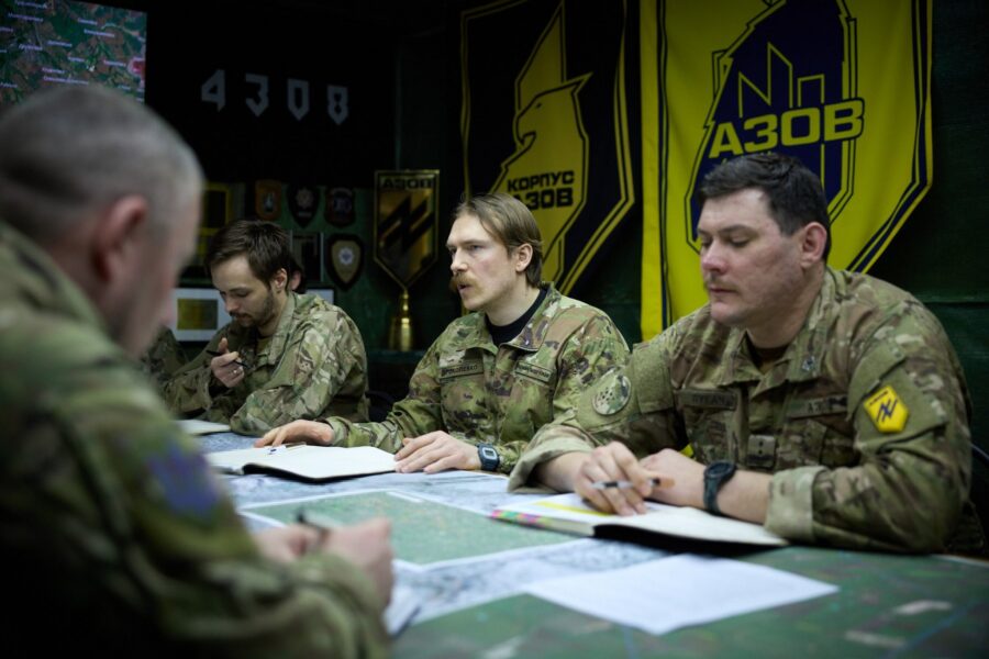 Президент України Володимир Зеленський під час поїздки до військових підрозділів на Донеччині зустрівся з бійцями 12-ї бригади спеціального призначення “Азов” Національної гвардії України та командуванням 11-го і 19-го армійських корпусів.
