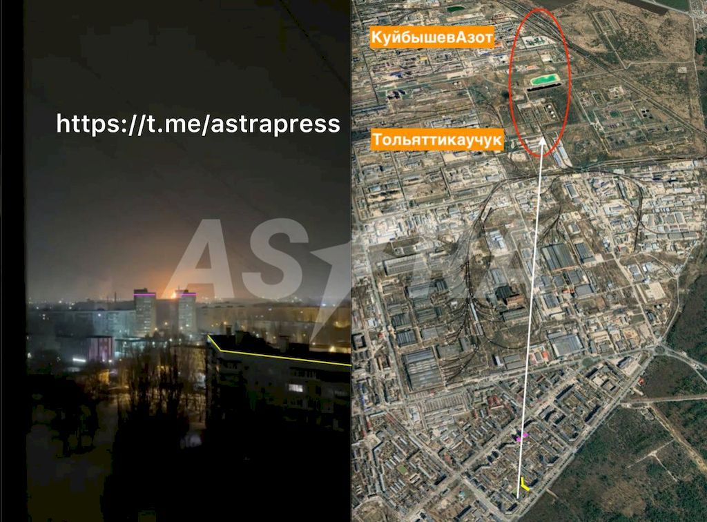 Як пише Astra, у Тольятті після нічної атаки сталася пожежа в районі розташування двох хімічних підприємств — “Тольяттікаучук” та “КуйбишевАзот”.