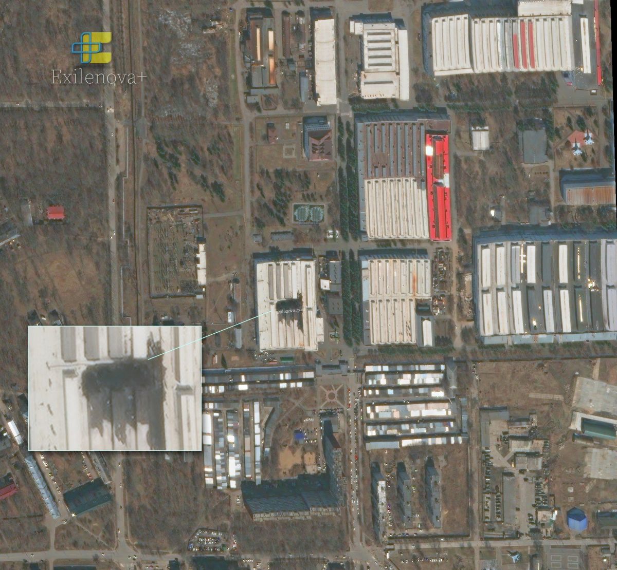 На супутникових знімках видно пошкодження одного з виробничих корпусів підприємства — обвалилися кілька прольотів покрівлі будівлі.