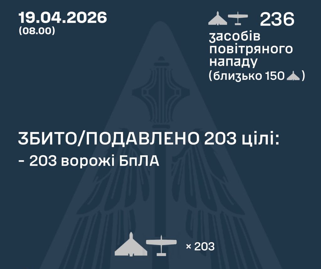За попередніми даними, станом на 08:00, протиповітряною обороною збито/подавлено 203 ворожі БпЛА типу Shahed, “Гербера”, “Італмас” та дрони інших типів на півночі, півдні та сході країни.